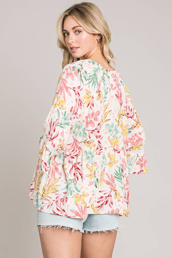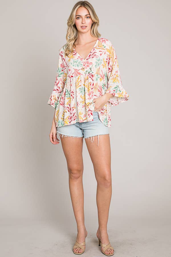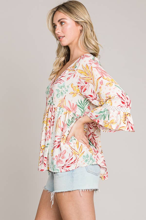 Bracelet sleeve length V-nk babydoll Printed top with crochet trim lace inset Model is wearing size "SMALL" Height 5' 10" Bust 32'' Waist 24" Hips 38