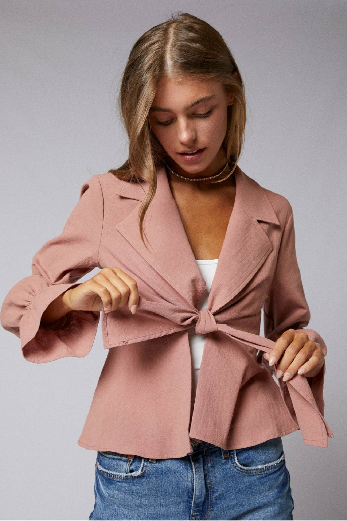 Ruffle Tie Front Jacket: Dusty Rose / Large