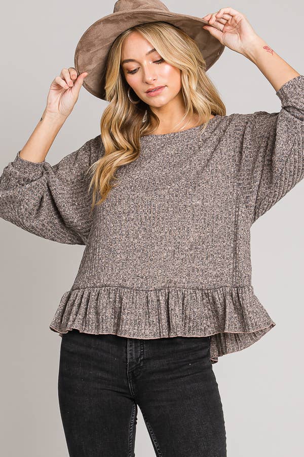 Long sleeve ruffle hem brushed rib knit top Brushed Rib Knit Long Sleeves Ruffle hem top - Oversized