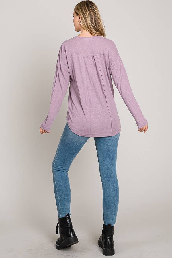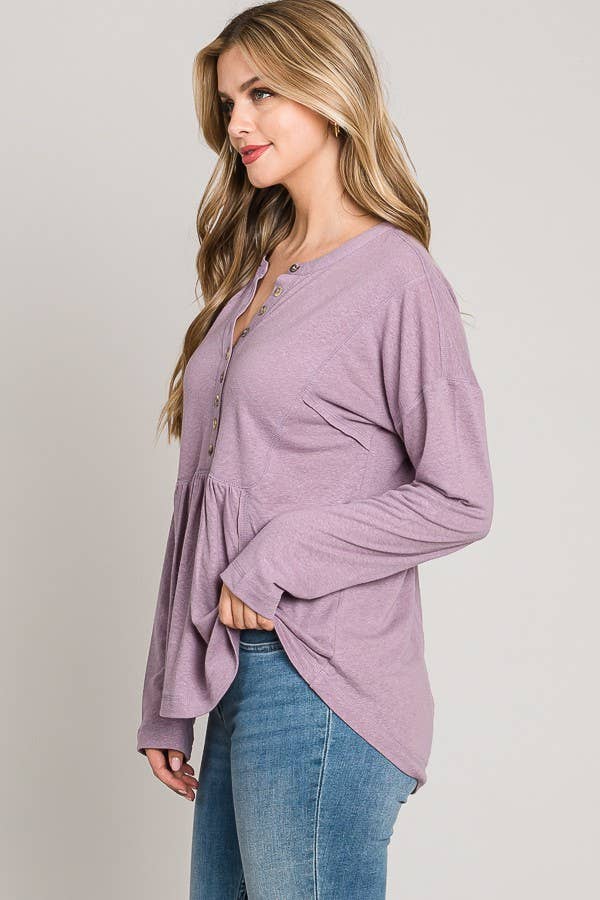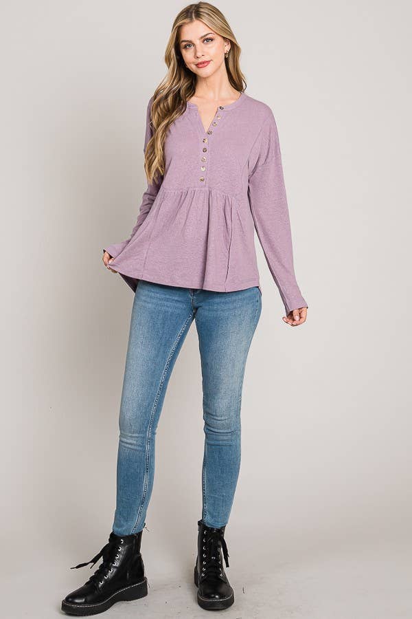 Long Sleeves Button Bib Henley Top Model is wearing size "Small" Bust 32" Waist 24" Hips 34" 1/2
