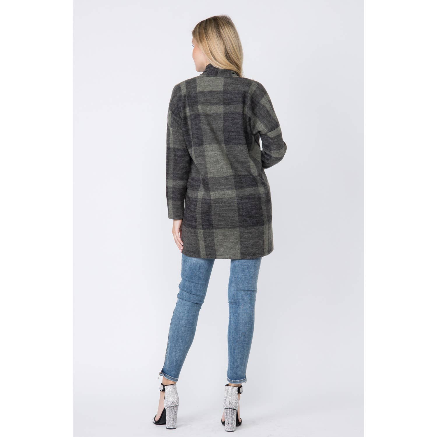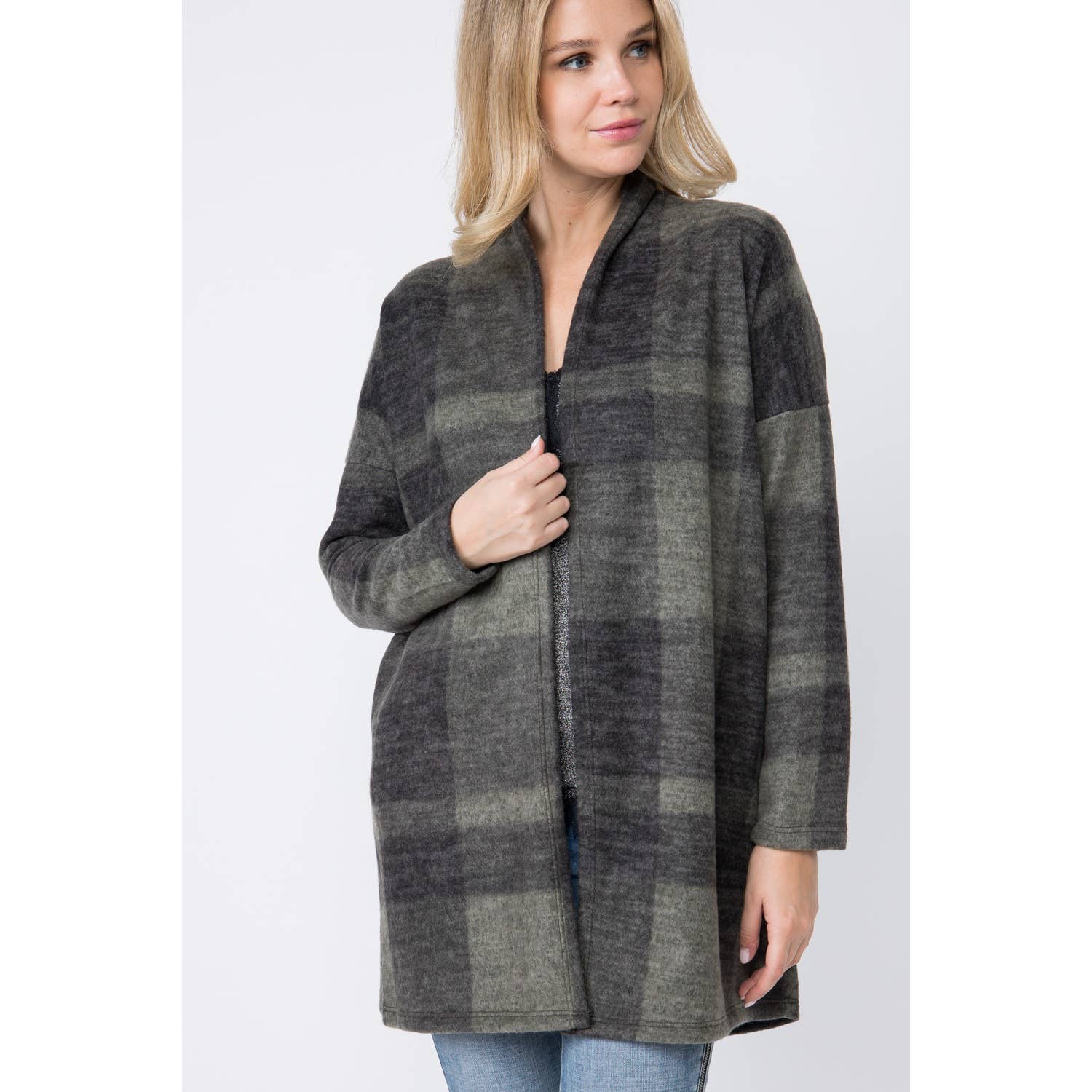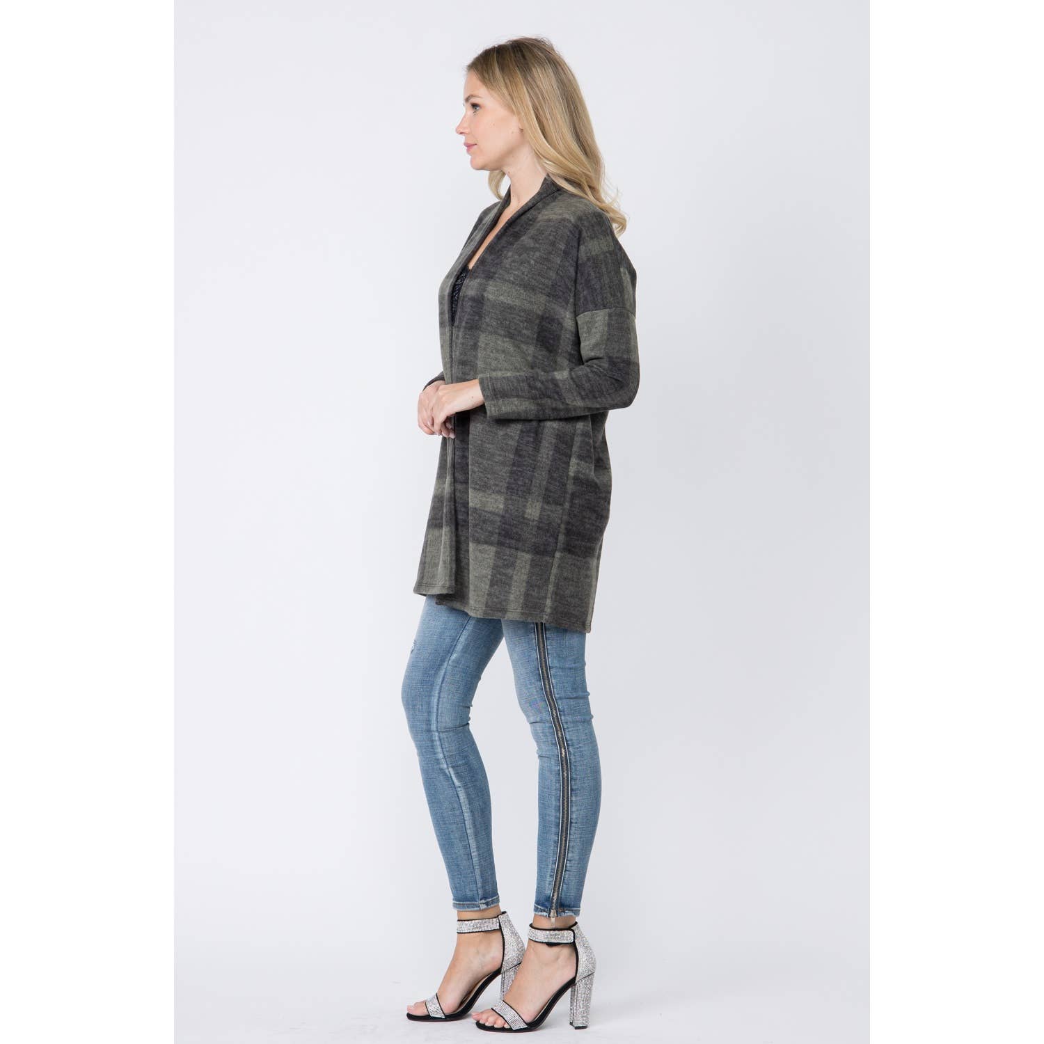 PLAID LONG SLEEVE CARDIGAN: BLACK-OLIVE